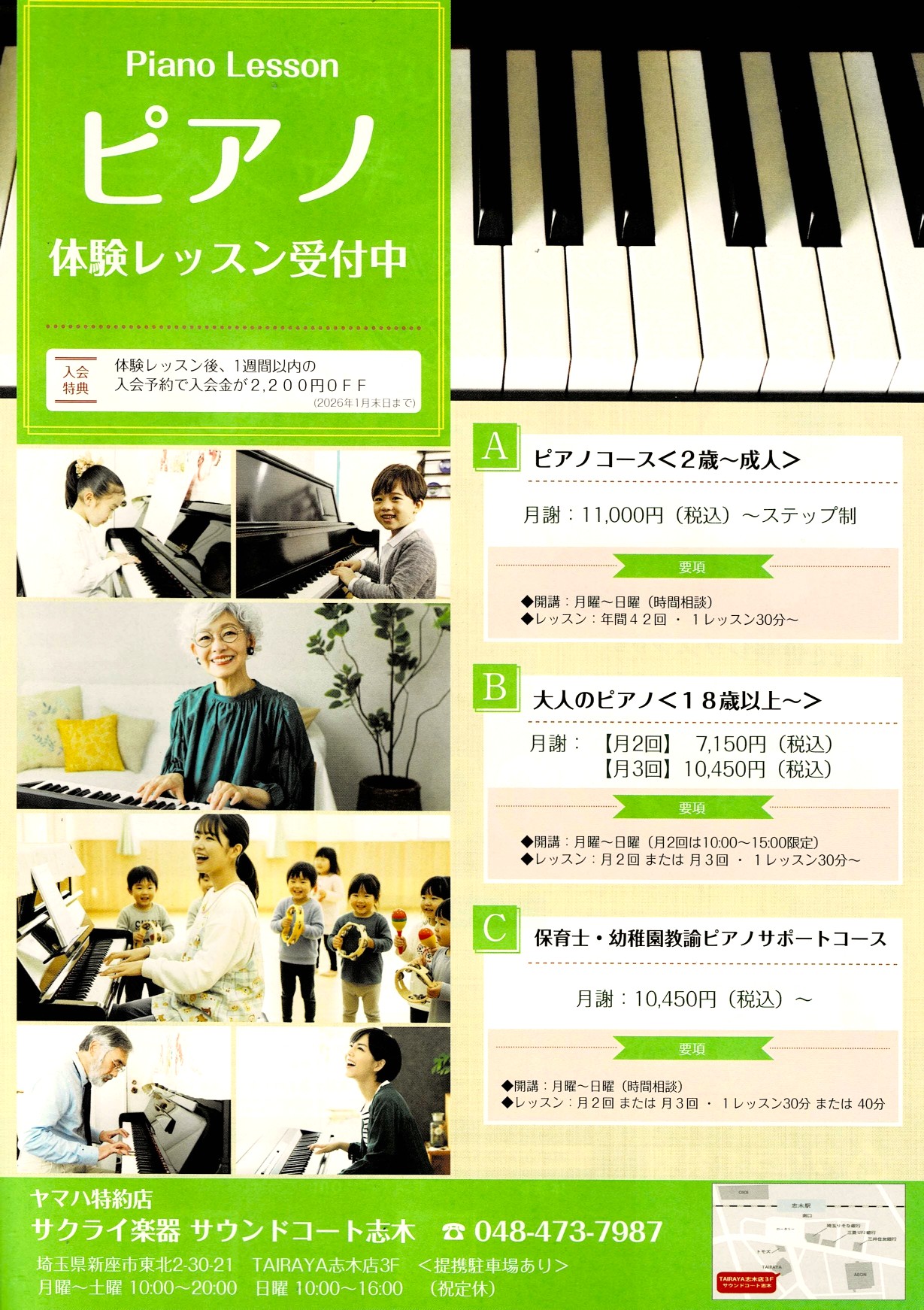 東武東上線・志木駅南口から徒歩1分、地元密着型スーパー TAIRAYA志木店の3Fにある教室です。