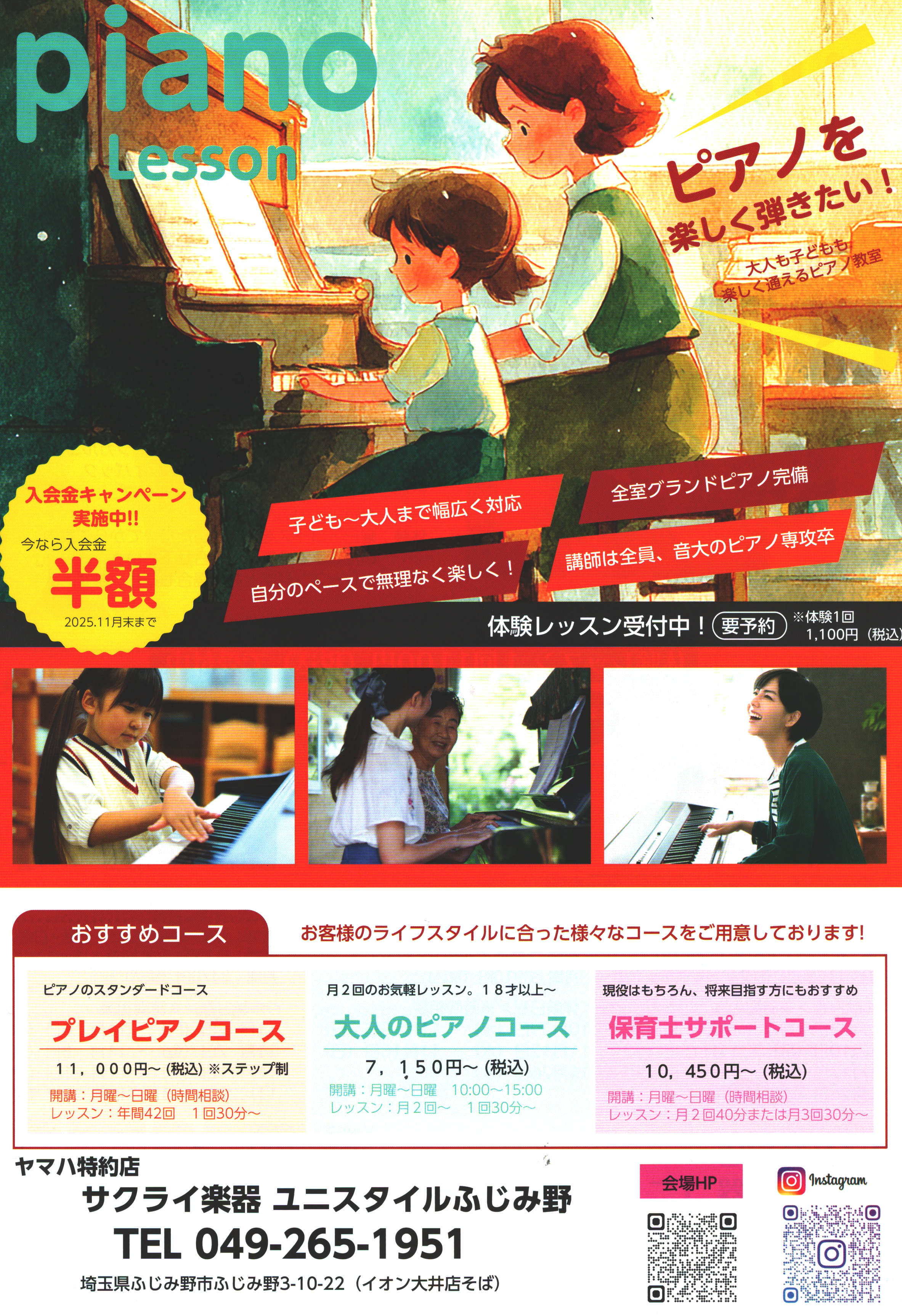 教室は全部で13部屋あり、ピアノやエレクトーンだけでなく様々なコースを展開しております。大型スーパーや喫茶店のすぐ近くですので、ぜひお気軽にお立ち寄りください♪
