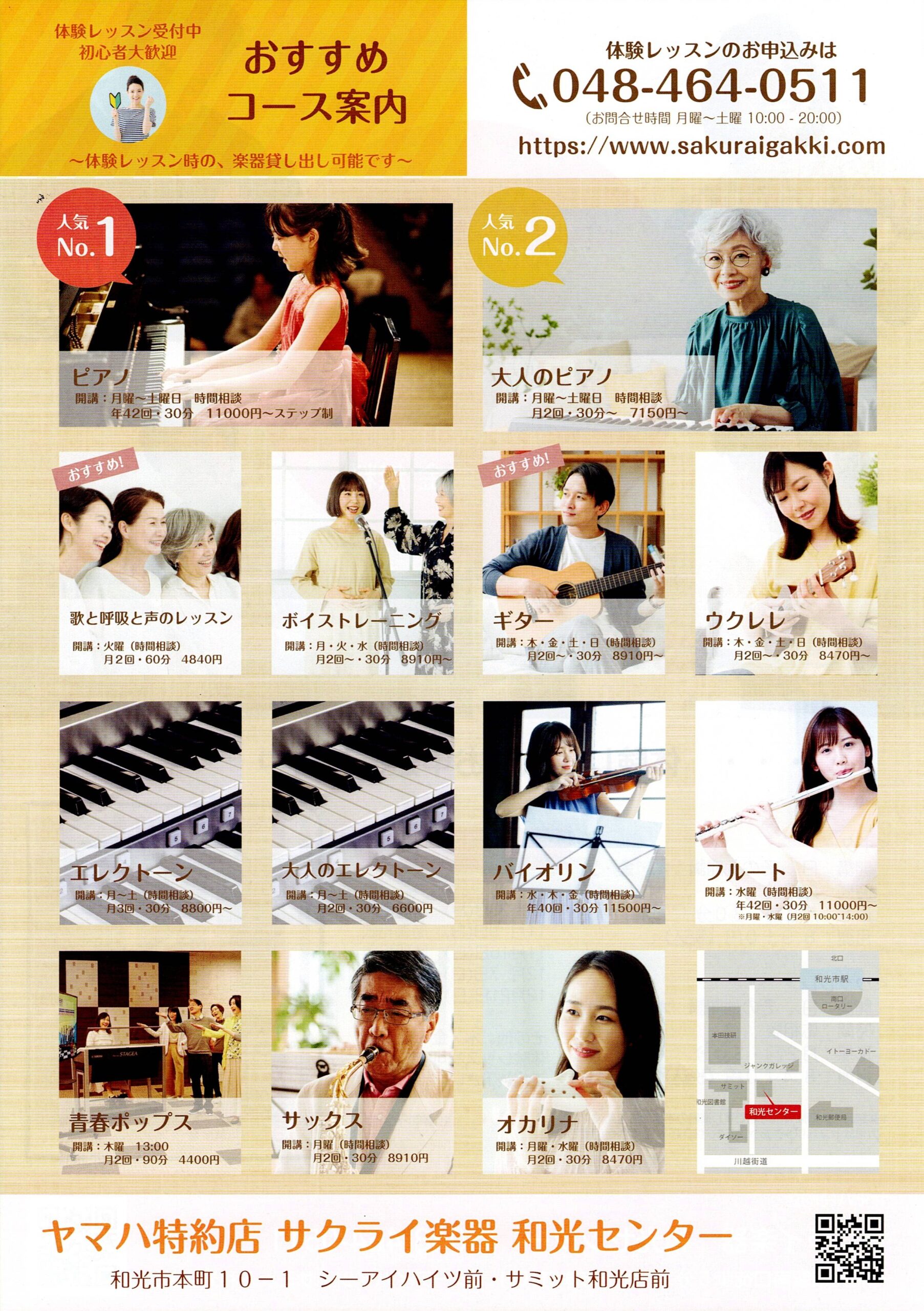 ヤマハ音楽教室のほかピアノ・ギター・フルート・ヴァイオリン・ボーカル・歌のグループレッスンなど、お子様から大人の方まで楽しめるコースを開講中です。