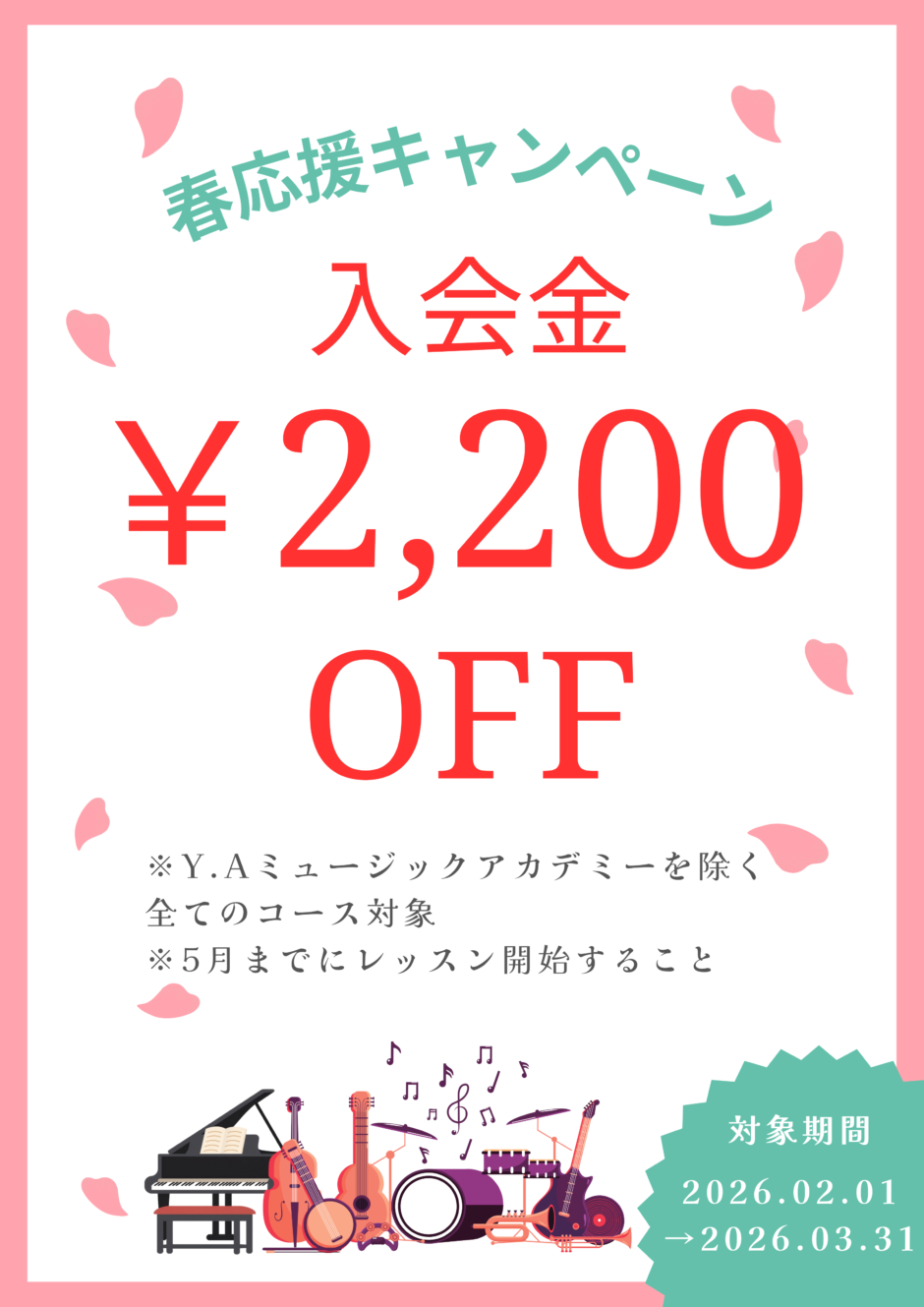 ホーム 石神井公園2月3月キャンペーン情報 2026年1月30日 SHARE ツイート シェア はてブ LINE Pocket 2月3月に体験入会の方は入会金¥2,200 OFF! まずは体験レッスンにお問い合わせください♪ ☎03-3904-2211(サウンドコート石神井公園まで)