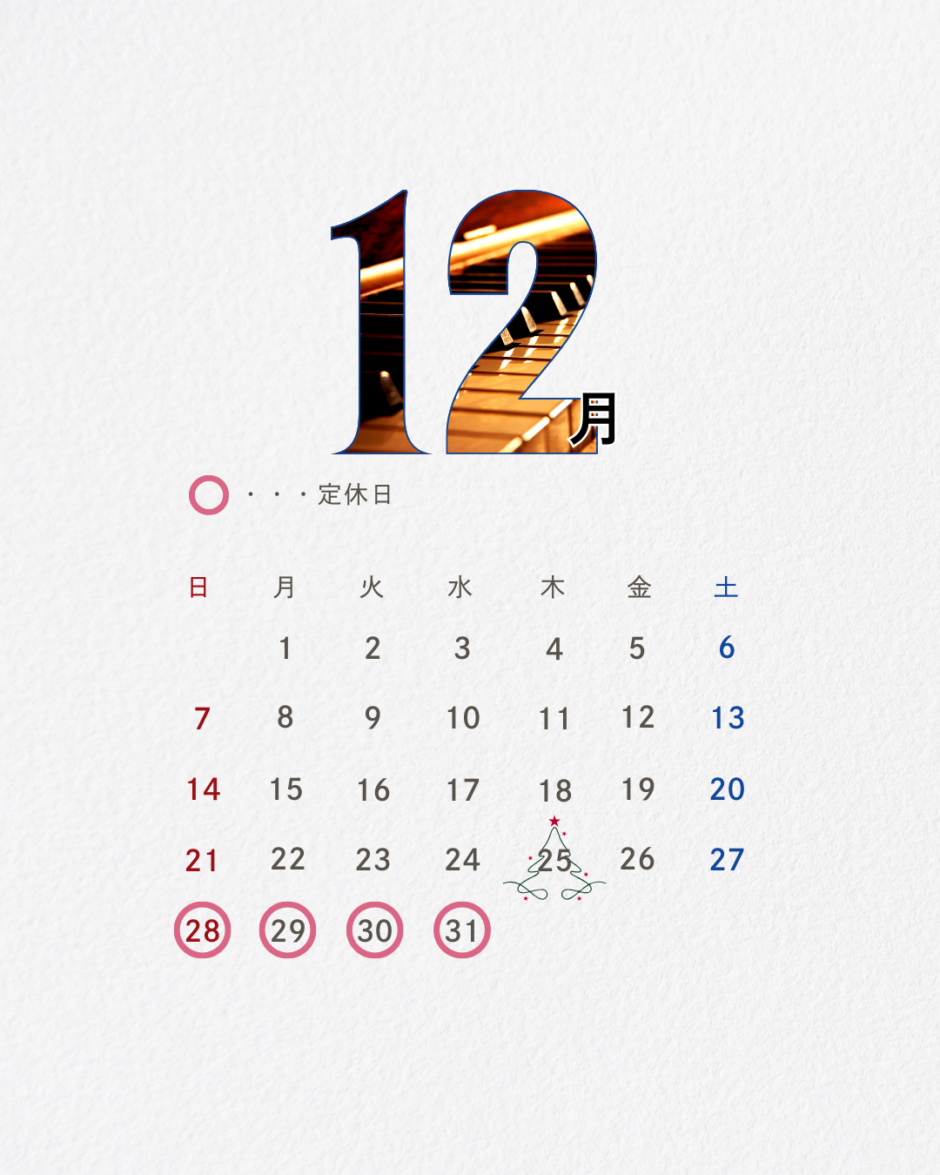 ホーム 12月スケジュール 2025年11月26日 SHARE ツイート シェア はてブ LINE Pocket サウンドコート石神井公園は12月28日より教室は冬期休暇となります。 それに伴い、レジ入金が必要なお手続き(入会手続き・楽譜の購入・教室レンタル等)は25日までとさせていただきます。